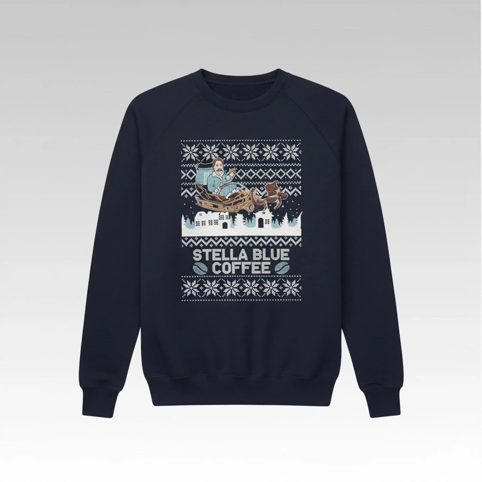This year’s design puts a hilarious spin on Christmas iconography. The center graphic features a stylized illustration dressed in festive attire and riding a coffee-powered sleigh. Beneath the snowy landscape and reindeer, the Stella Blue Coffee text sits prominently, framed by classic "ugly sweater" patterns like snowflakes and geometric fair-isle borders.