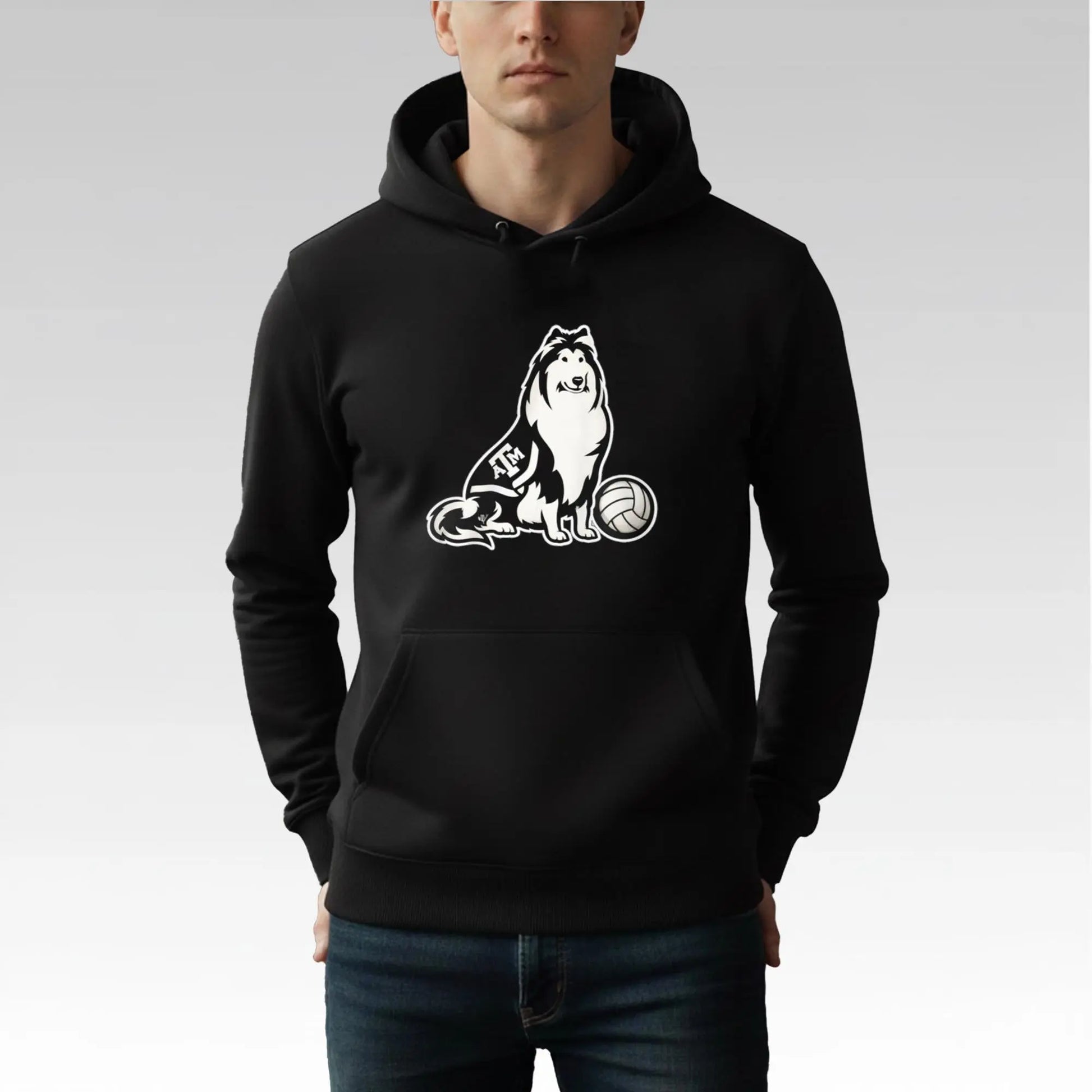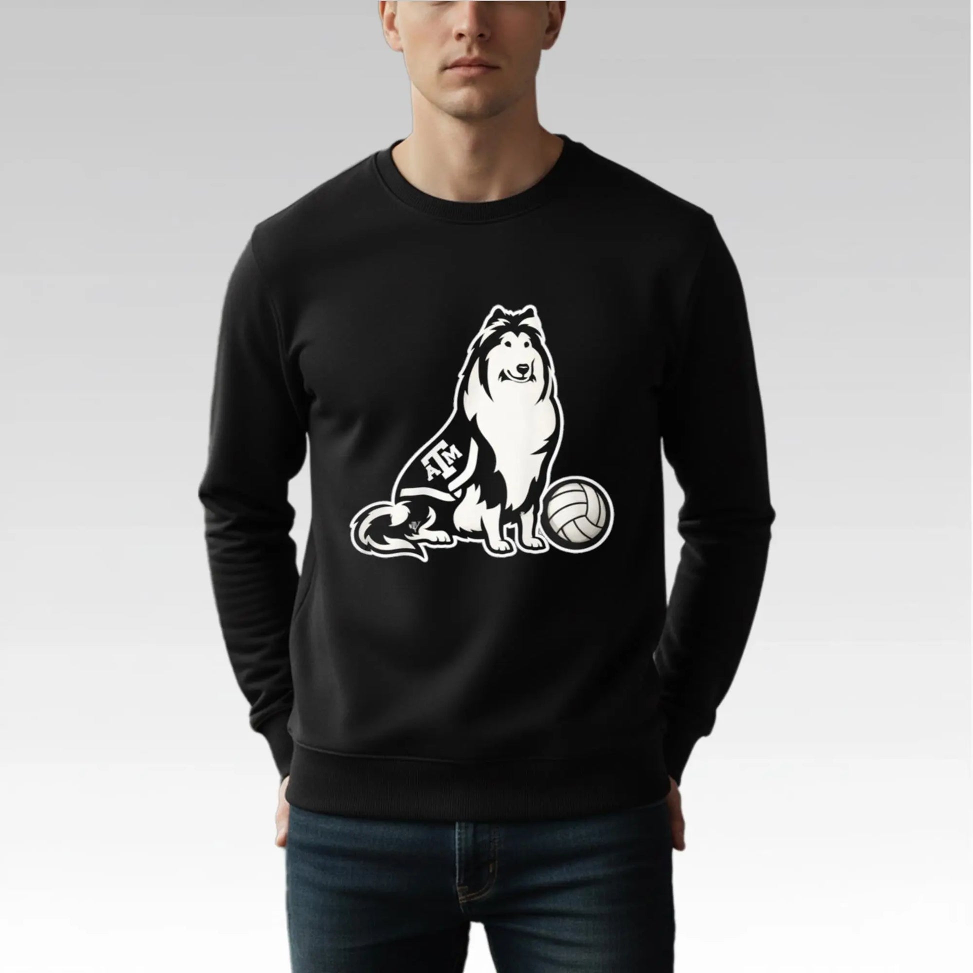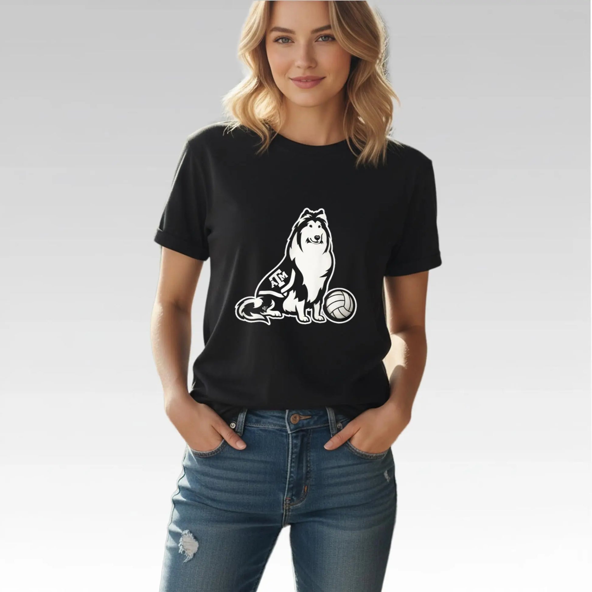 The shirt features a striking, minimalist white-on-black graphic of the iconic Rough Collie mascot. In this design, Reveille is poised gracefully beside a volleyball, blending the university’s most beloved symbol with the competitive spirit of the court. The "ATM" logo is subtly integrated into her signature blanket, ensuring your school pride is front and center.