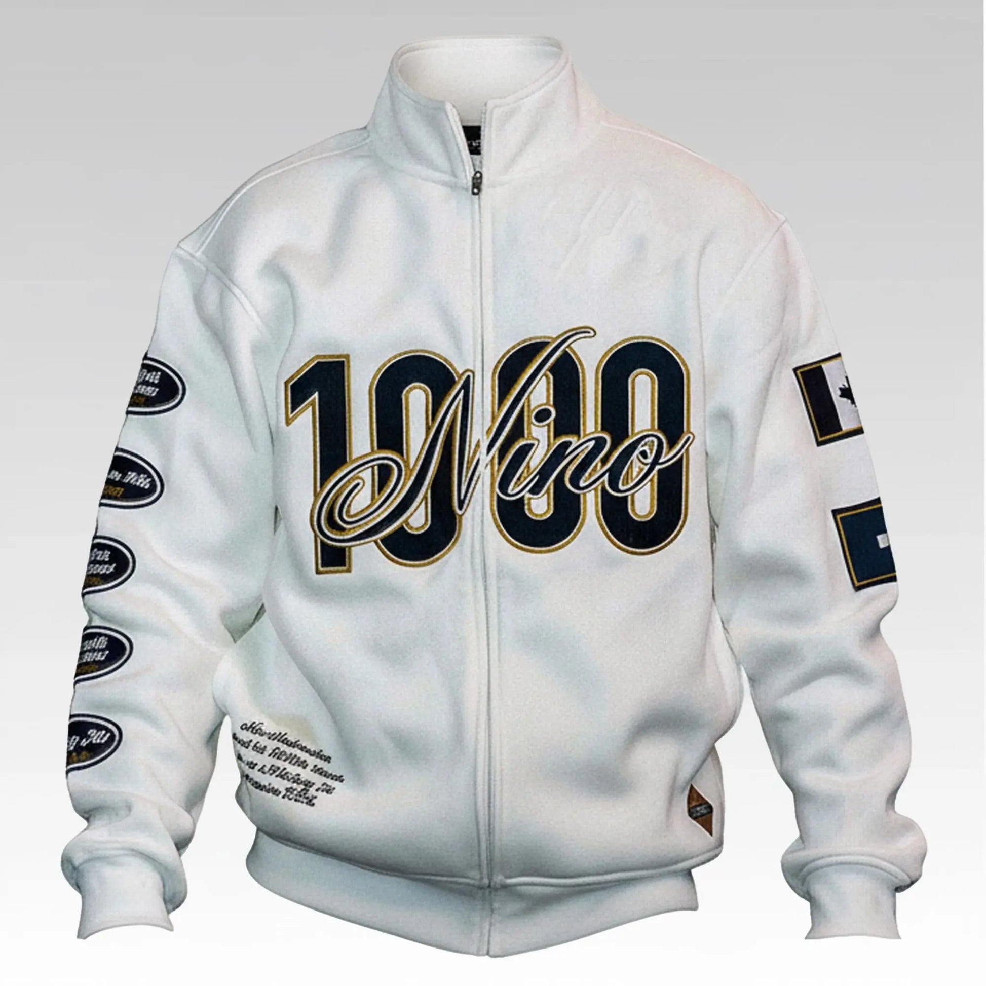 This meticulously crafted zip-up jacket is designed to commemorate Nino Niederreiter reaching the incredible plateau of 1,000 professional games. The design features a crisp, clean white base that allows the gold and navy detailing to pop. Across the chest, "1000 Nino" is emblazoned in a dynamic script and block font combination, symbolizing his powerful presence in the sport. The right sleeve is decorated with oval patches, each representing a different franchise Niederreiter has played for throughout his journey, chronicling his path to this historic moment.