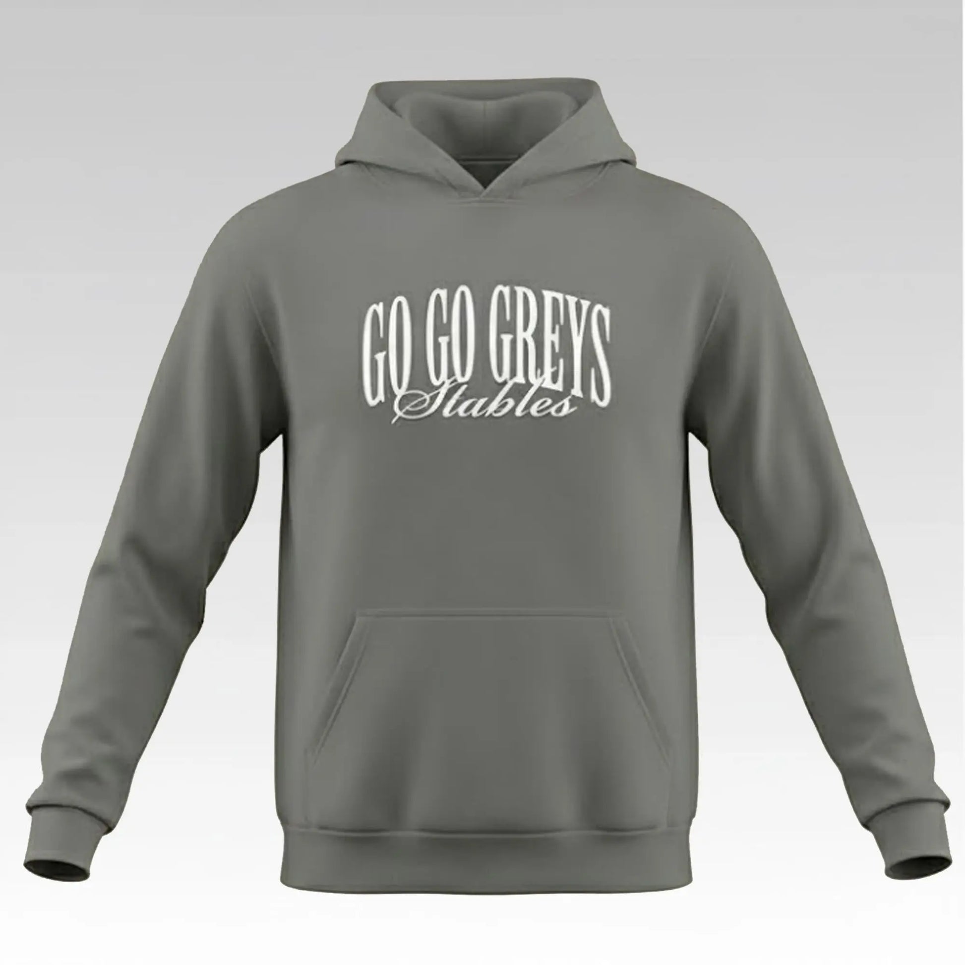 This charcoal grey hoodie is more than just a comfortable layer; it is a tribute to the thrilling world of horse racing stables. The design features the "GO GO GREYS" typography in a bold, arched collegiate font, underscored by the elegant, script-style "Stables" text. This contrast between modern block lettering and classic cursive creates a timeless look that resonates with both old-school racing enthusiasts and modern trendsetters.