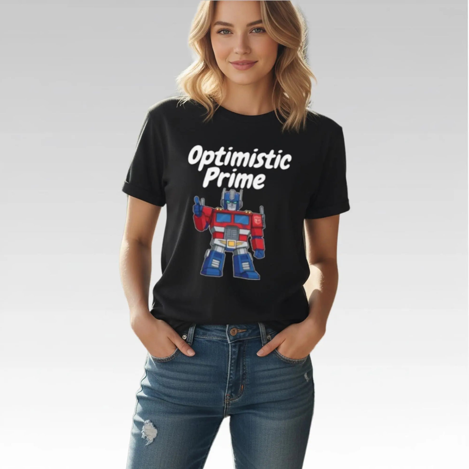 This tee is crafted for those who appreciate a clever pun and high-quality comfort. The design features a vibrant, cartoon-style illustration of the legendary leader of the Autobots, Optimus Prime. However, there is a twist: the character is striking a friendly "thumbs up" pose, accompanied by the playful text "Optimistic Prime" in a bold, white, bubble-style font.