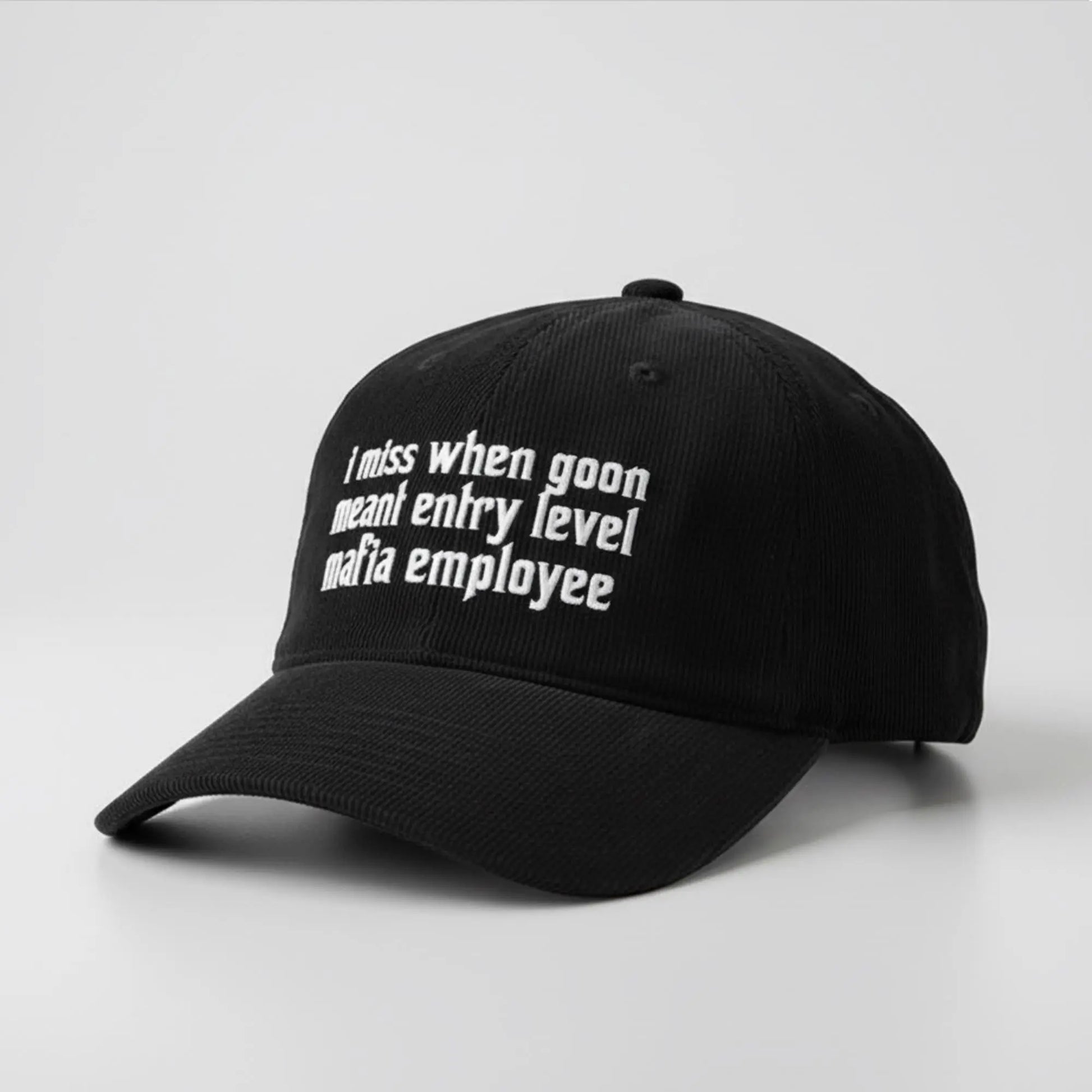 This hat is more than just headwear; it is a witty social commentary wrapped in a vintage aesthetic. The design features the phrase "I miss when goon meant entry level mafia employee" embroidered in a crisp, white serif font that stands out boldly against the deep black fabric.