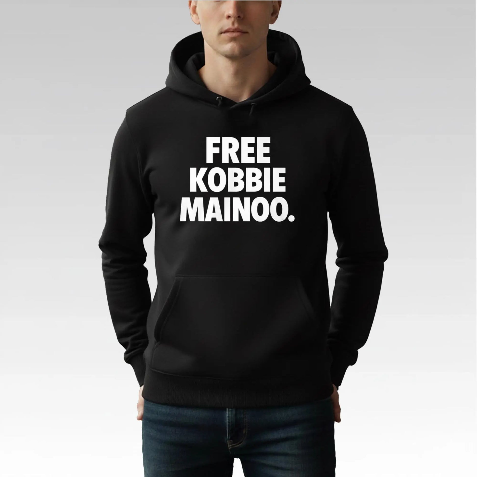 Capture the energy with this must-have design. This shirt features the stark, impactful slogan "FREE KOBBIE MAINOO" printed in bold, capitalized white typography against a premium black background. The design is minimalist yet loud, perfect for fans who appreciate direct messaging and clean aesthetics.