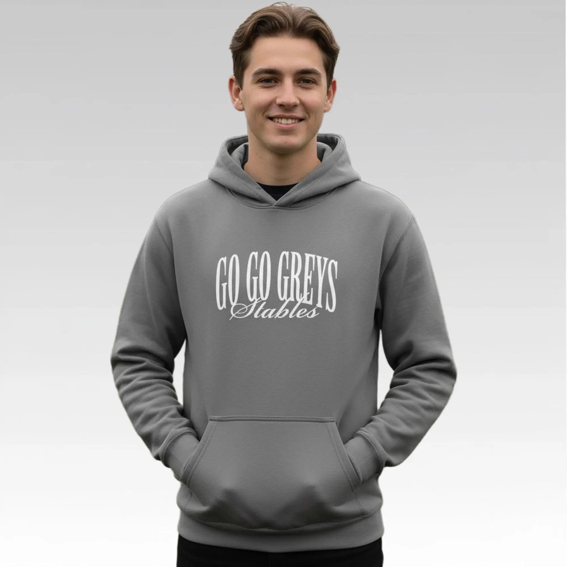 The Go Go Greys Stables Hoodie features a sophisticated, minimalist design that speaks volumes to insiders of the racing community. The chest showcases the "GO GO GREYS" typography in a bold, condensed serif font, beautifully contrasted by the elegant "Stables" script underneath. This design honors the Go Go Greys initiative—a celebrated movement in horse racing circles focused on the ownership and appreciation of grey thoroughbreds.