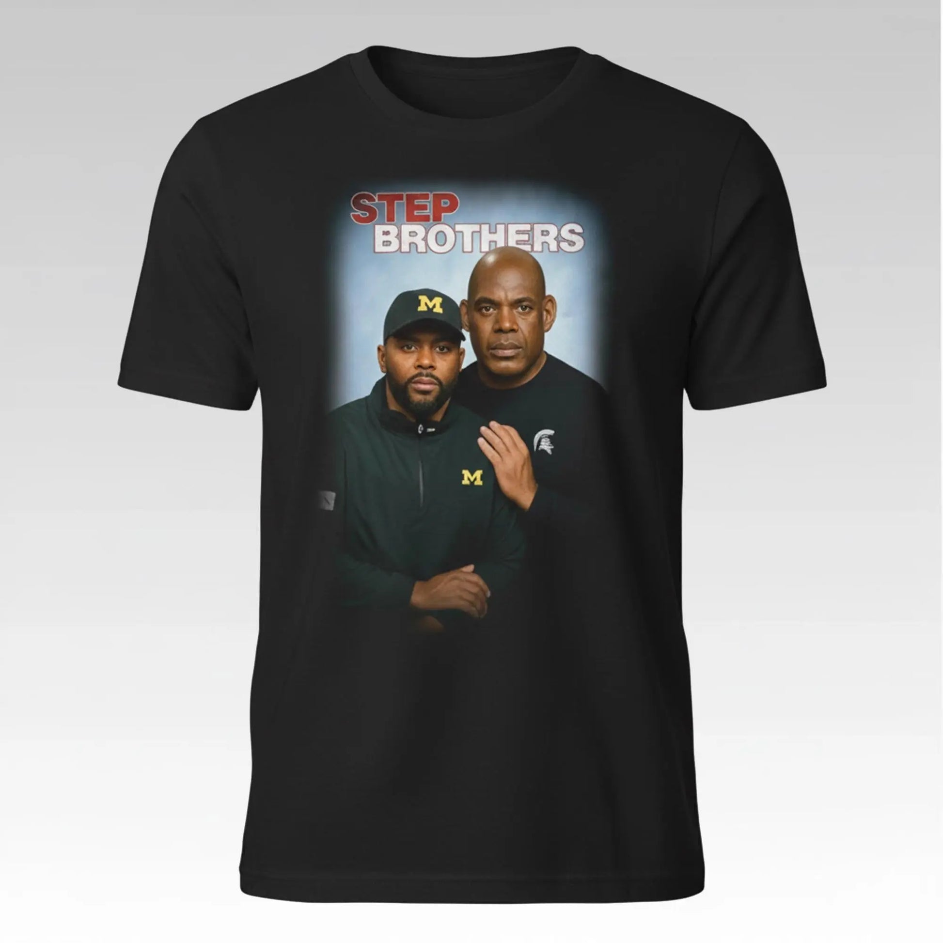 The centerpiece of the shirt is a bold graphic image, prominently featuring current Michigan State coach Sherrone Moore in his signature 'M' uniform, standing alongside former Michigan State coach Mel Tucker. The image is framed below the unmistakable STEP BROTHERS title logo.