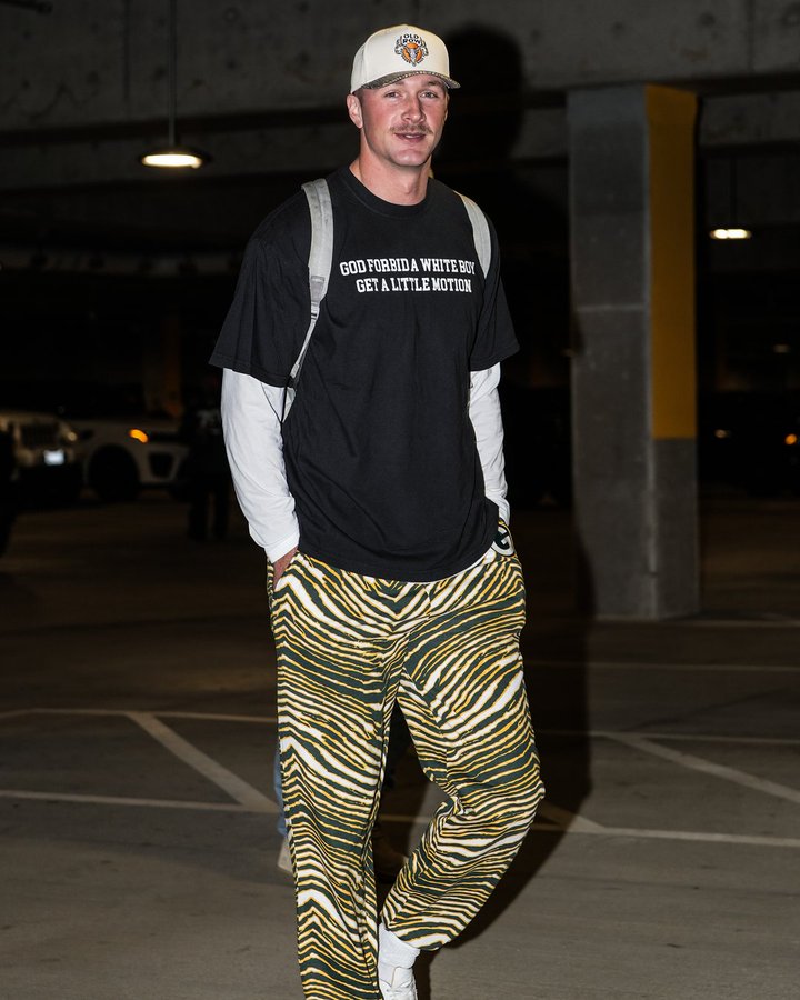 This isn't just a t-shirt; it’s a replica of the exact fit that turned heads across the football world. Tucker Kraft was spotted rocking this design paired with bold green-and-gold zebra print pants, proving that a "tunnel fit" is an art form.